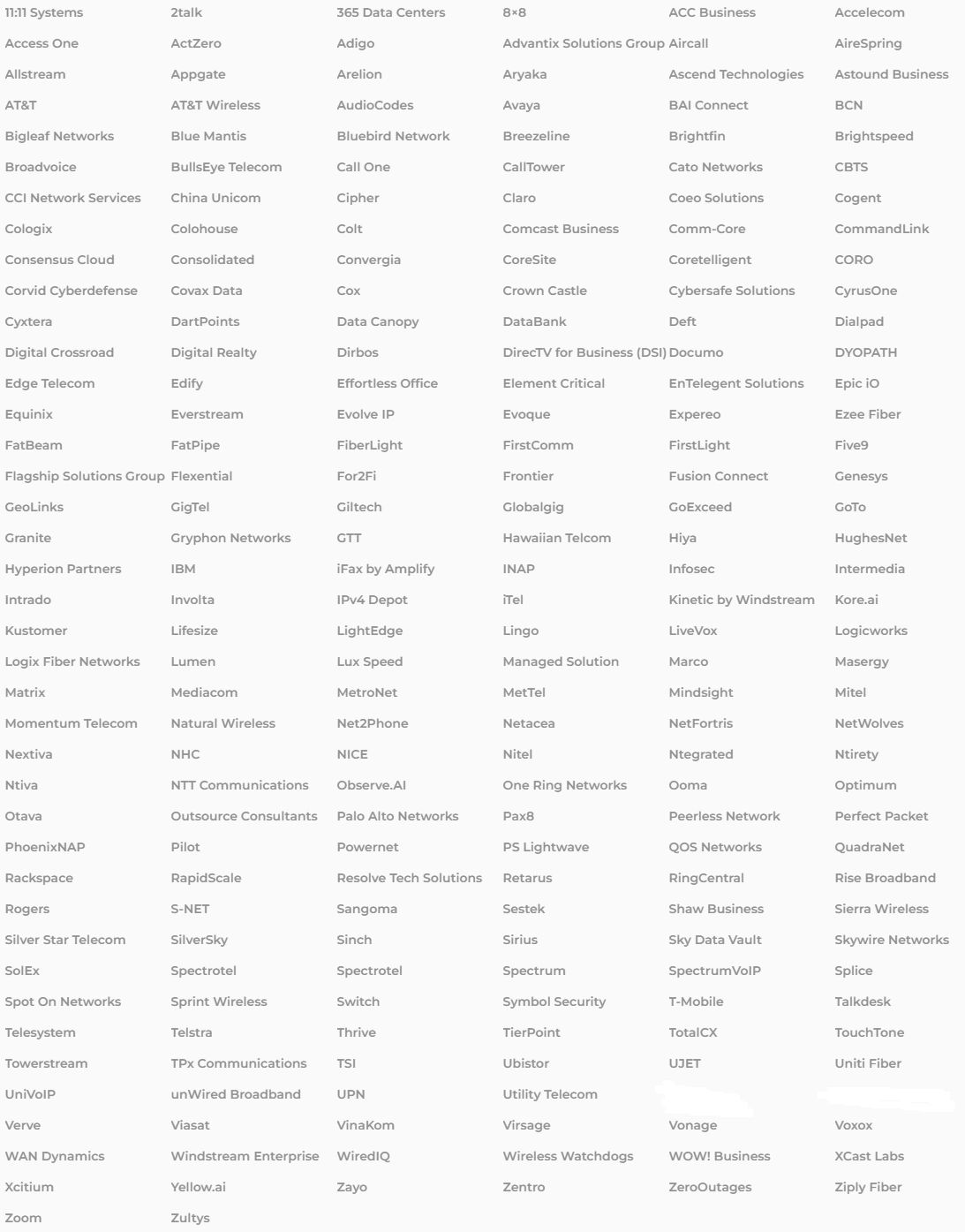 AT&T, Spectrum, Cox, RingCentral, Broadvoice, Net2phone, Comcast, Altice, Windstream, CenturyLink/Lumen, 8x8, Nextiva, Dialpad, TPx, ACC Business, 2talk, Cogent Communications, Cato Networks, VeloCloud, Bel Air Internet, AireSpring, Allstream, Appgate, BullsEye Telecom, Broad Sky Networks, BCN, China Unicom, Crown Castle, Cyxtera, Databank, Dyopath, Edify, Hypercore, Peerless Network, Nitel, Intermedia, LogMein/GoTo, Managed Solution, MetTel, RapidScale, Five9, NICE/InContact, ZeroOutages, Zoom, Talkdesk, Sonic, SolEx, Vonage, Claro, Adigo, Access One, Call One, BigLeaf Networks, Flexential, FiberLight, Equinix, EnTelegent, GTT, Granite, Sangoma, QOS Networks, Telstra, Wirelesss Watchdogs, Viasat, XCast Labs, WiredIQ, Utility Telecom, TSI TierPoint, Switch, SpectrumVoIP, Masergy, Netwolves, Momentum Telecom, NFINIT, Ooma, One Ring Networks, PhoenixNAP, Towerstream, Zayo, Zoom, Zultys....and more....